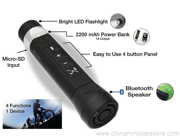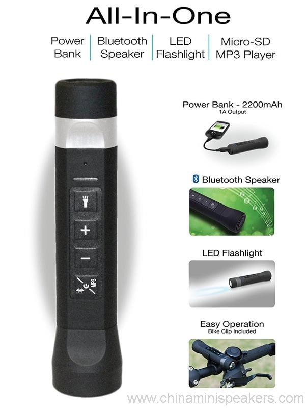 - 4-ഇൻ -1 പ്രവർത്തനം: 2200mAh പവർ ബാങ്ക്, ബ്ലൂടൂത്ത് സ്പീക്കർ, LED ഫ്ലാഷ്ലൈറ്റ്, മൈക്രോ-എസ്ഡി കാർഡ് എംപി 3 പ്ലെയർ.